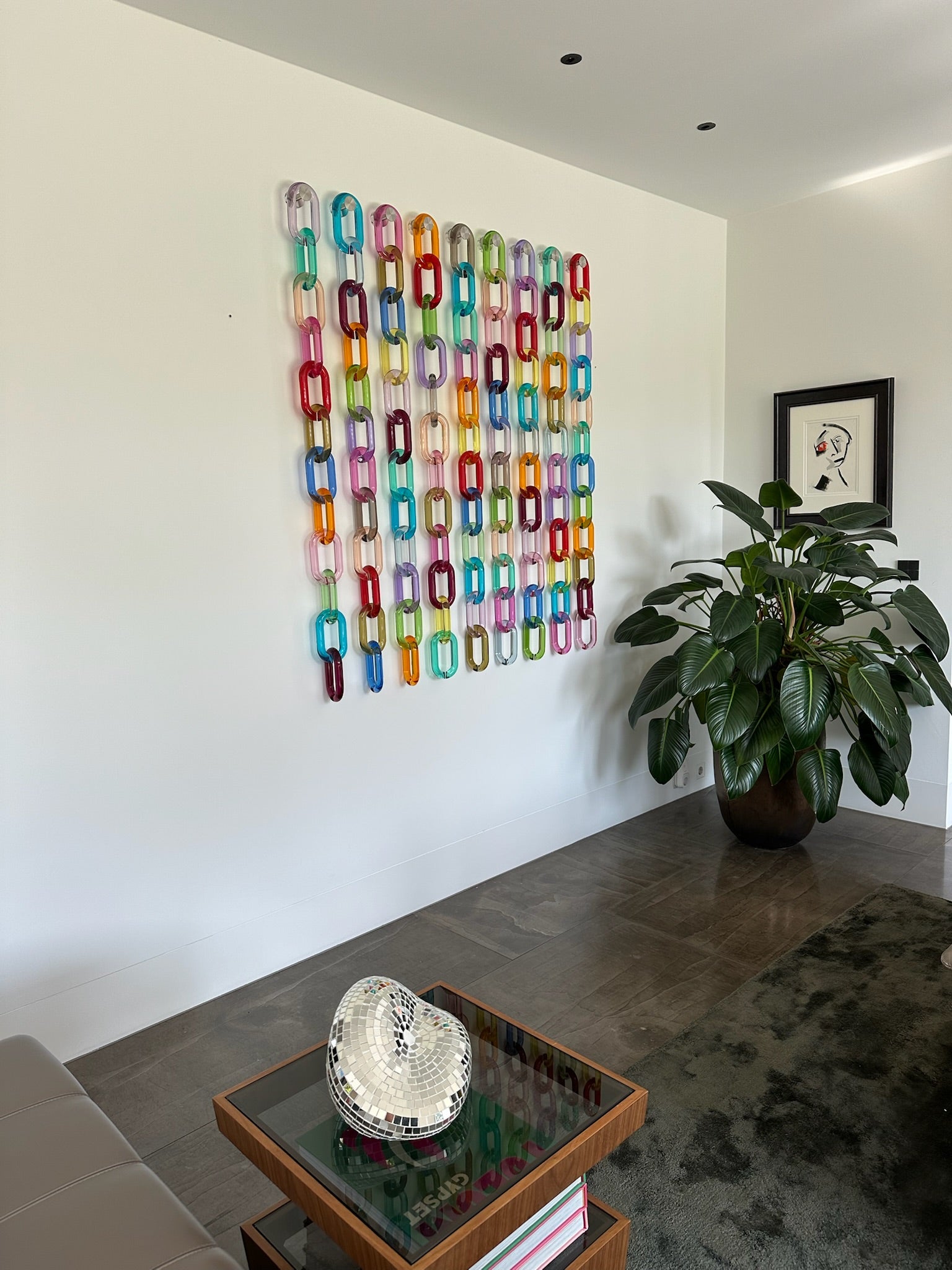 Disco Inferno is an explosion of color and light made by 108 links. Like an endless disco night cascading down the wall energetic, joyful, and unapologetically bold. Transparent acrylic rings in vibrant, contrasting hues catch and reflect the light, allowing the piece to shift and transform with its surroundings.