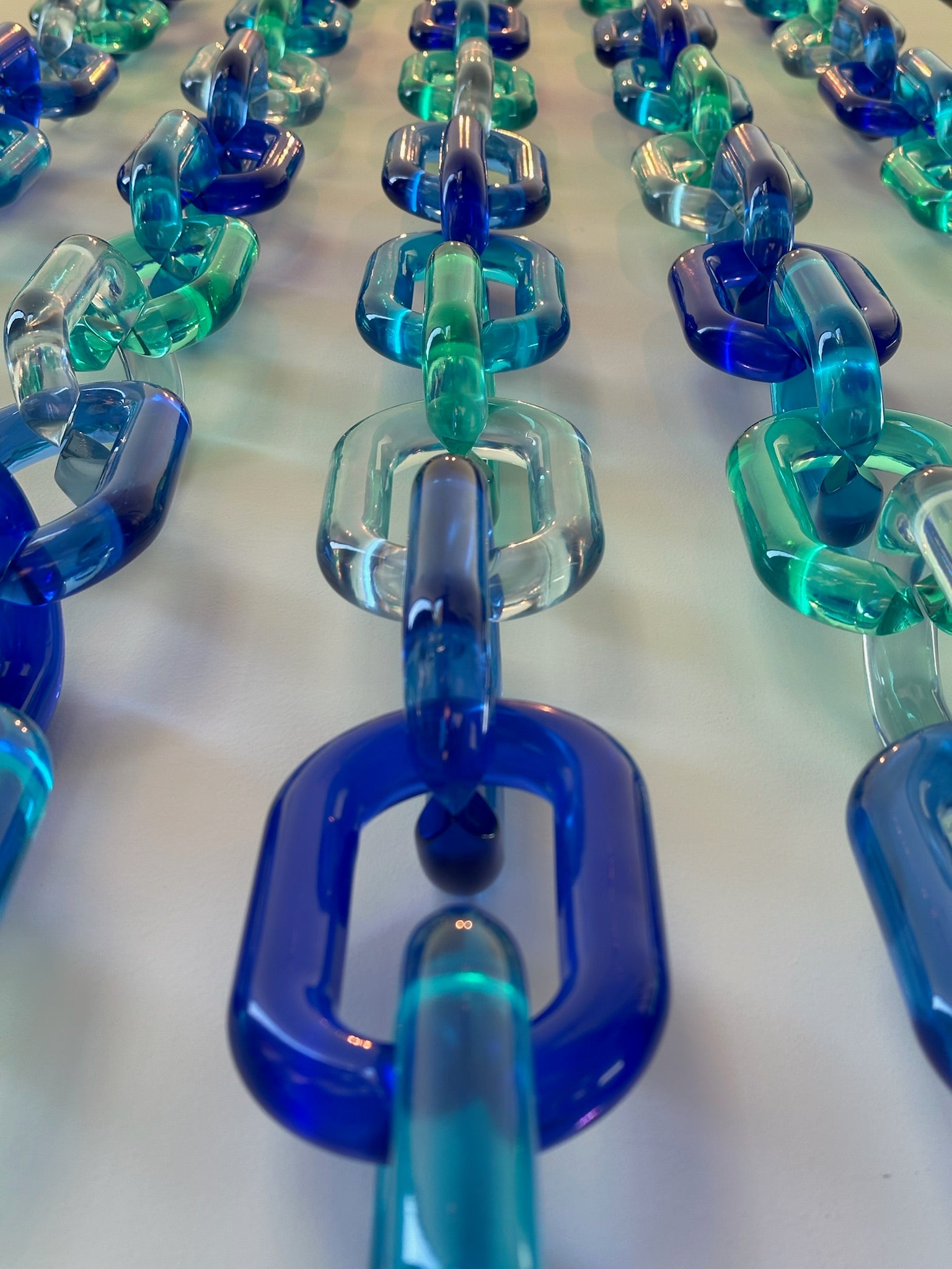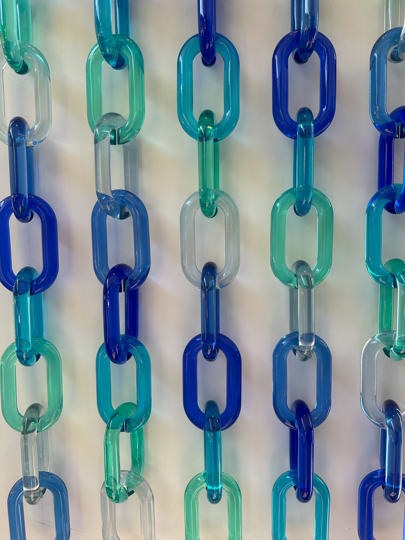 Composed of 85 acrylic rings, this work draws its color inspiration from water in motion. Blue and green tones move through the piece in a gentle rhythm, while transparent elements create a sense of depth and lightness, like looking into a pool.